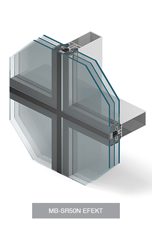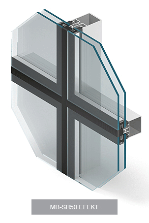 The system is designed for the construction and execution of flat, light-weight curtain walls of the suspended or filling type, roofs, skylights and other structures. The system is a modification of a very popular MB-SR50 façade system, meeting the demands of current trends in architecture.